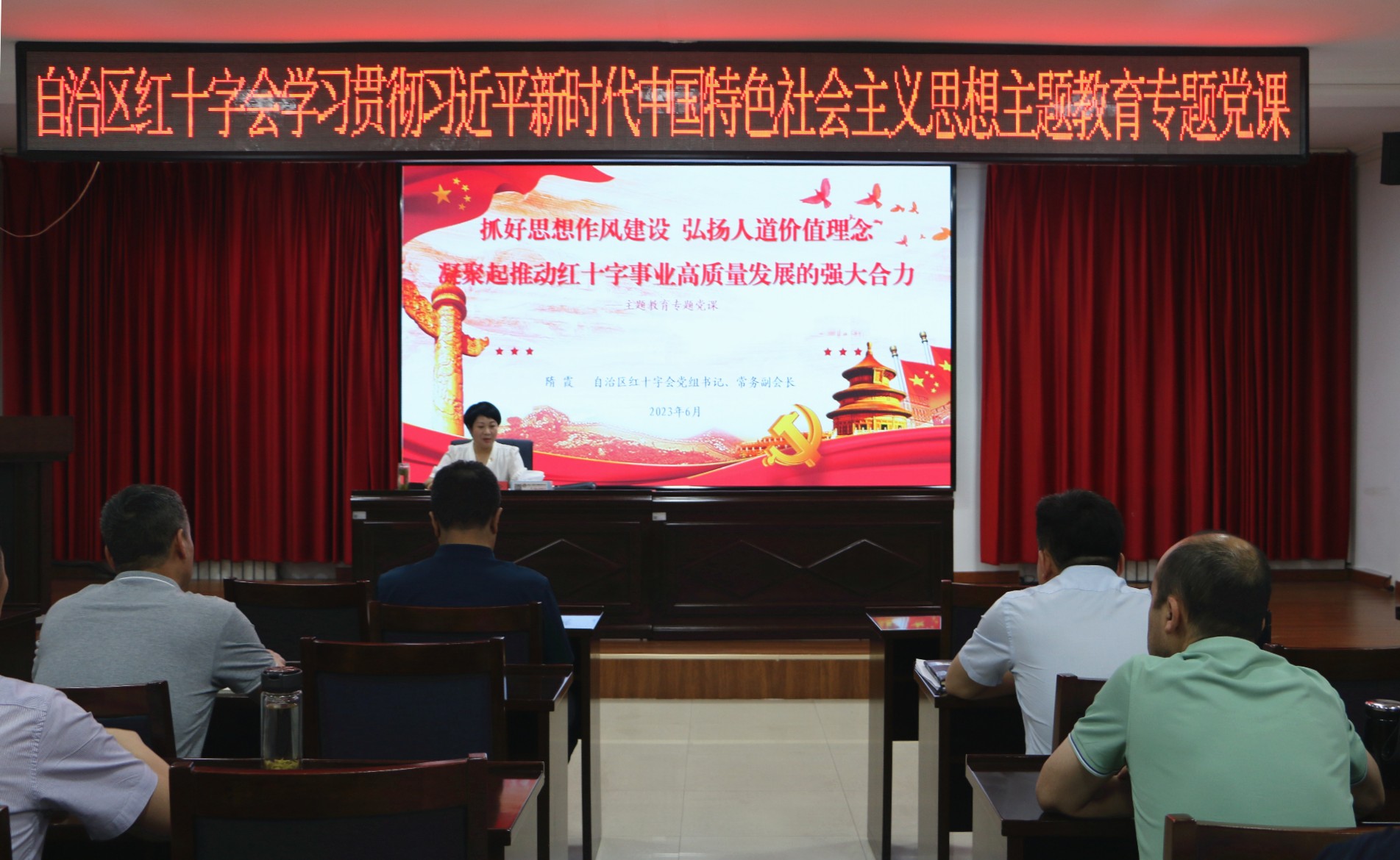 为推动学习贯彻习近平新时代中国特色社会主义思想主题教育走深走实,按照主题教育工作部署,6月13日,自治区红十字会党组书记、主题教育领导小组组长隋霞以《抓好思想作风建设 弘扬人道价值理念 凝聚起推动红十字事业高质量发展的强大合力》为题作专题党课辅导,引导会机关党员干部深入学思践悟习近平新时代中国特色社会主义思想,牢牢把握“学思想、强党性、重实践、建新功”的总要求,以学铸魂、以学增智、以学正风、以学促干,为推动新疆经济社会高质量发展贡献红十字会力量?;峄厝宓吃备刹坎渭友?。